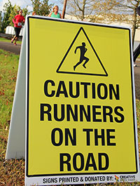A local high school fitness club holds an annual event which includes a 15k relay and 5K run walk. The director was concerned about the safety of the runners and wanted custom signs to mark the route, making drivers and runners aware of the route, incuding "Caution: runners on road" signs.