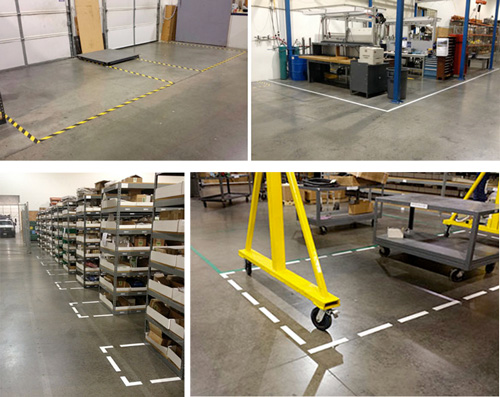 Floor marking shapes also helped this company achieve its goals. White strips and corners were used to mark areas where movable equipment such as carts and bins are placed. Combined, these markings break up floor space into color-coded areas.